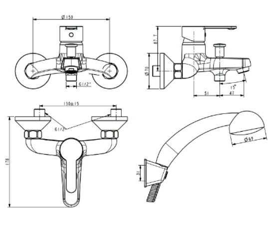 Mixer ini memiliki 2 instalasi drat untuk air panas dan dingin di dinding. Dengan 2 laju keluarnya air yaitu untuk hand shower dan kran untuk bathtub. Kelengkapan produk terdapat mixer shower, hand shower, hose dan hanger.