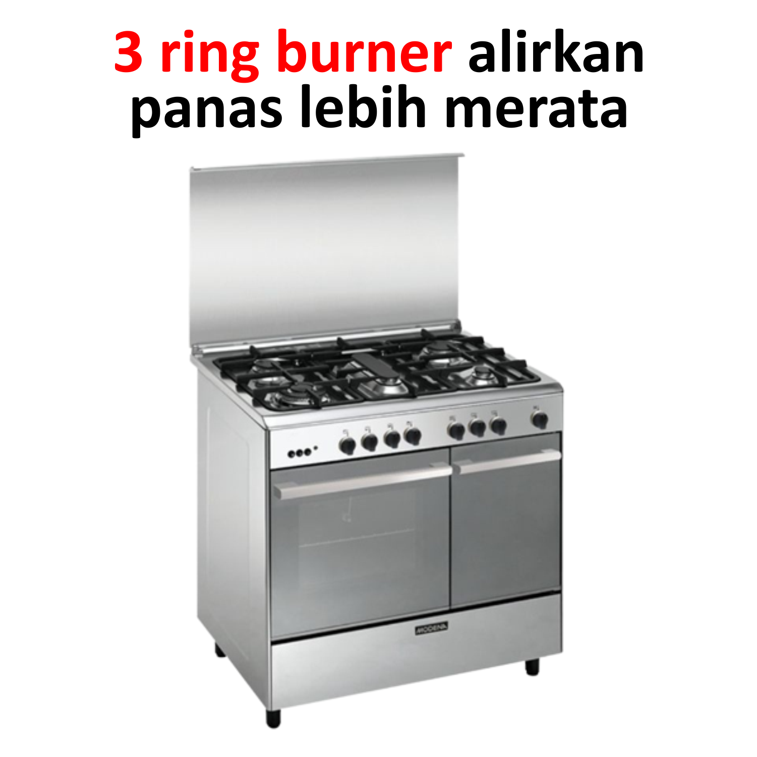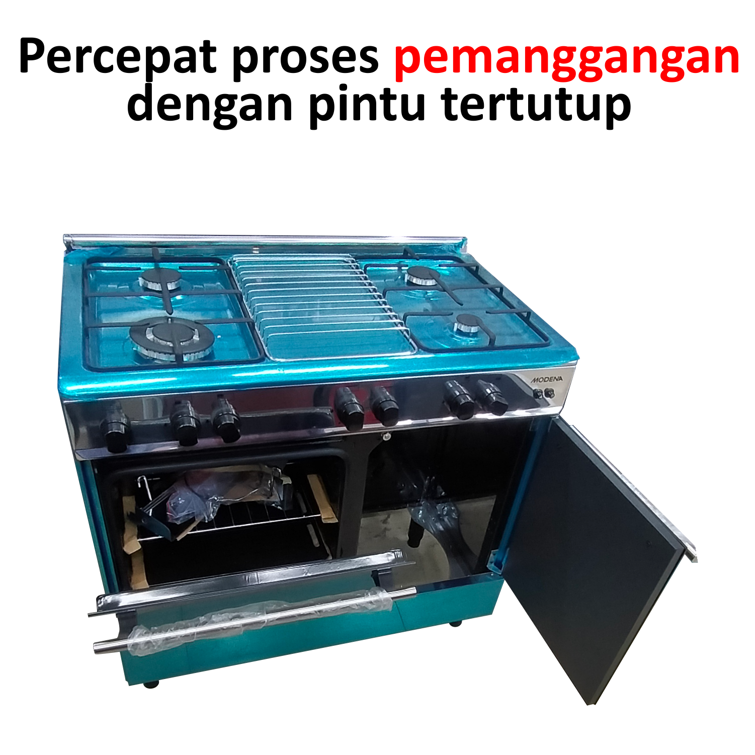 Hadir kompor freestanding MODENA FC 9942 S Cervia, satu set alat masak dengan 4 tungku dan satu set pemanggang berkapasitas 62 liter cukup muat banyak untuk sekali masak.
